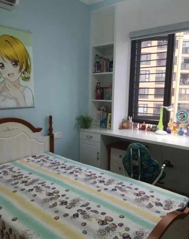 儿童房的设计则是另一种风格,采用了天蓝色的墙漆,显得更加清新自然。儿童房的一体式柜子设计,既解决了书桌和书架的需求,又节省了空间。