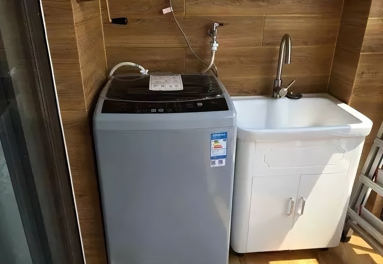 客厅的阳台采用了玻璃推拉门,方便实用。阳台是洗衣晾晒的区域,一端设有洗衣机和洗手盆,使用起来非常方便。